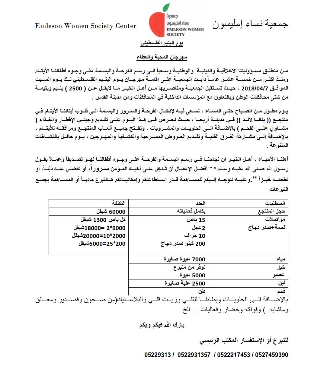 من منطلق مسؤوليتنا الاخلاقية والدينية والوطنية وسعياً الى رسم الفرحة والبسمة على وجوه أطفالنا الأيتام ومنذ اكثر من خمسة عشر عاماً دأبت الجمعية على إقامة مهرجان يوم اليتيم الفلسطيني لك يوم السبت الموافق 7/04/2018 ، حيث تستقبل الجمعية ومناصريها من أهل الخير ما لايقل عن ( 2500 ) يتيم ويتيمة من شتى محافظات الوطن وبالتعاون مع المؤسسات الداخلية في المحافظات ومن مدينة القدس .